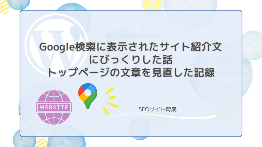 Google検索に表示されるサイト紹介文を見直した記録です。 トップページの文章が検索結果にどう表示されるかを確認し、実際に修正した内容をまとめています。 -