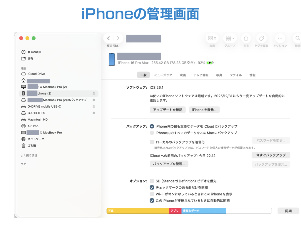 - FinderでiPhoneをクリックすると「管理画面」が表示される
