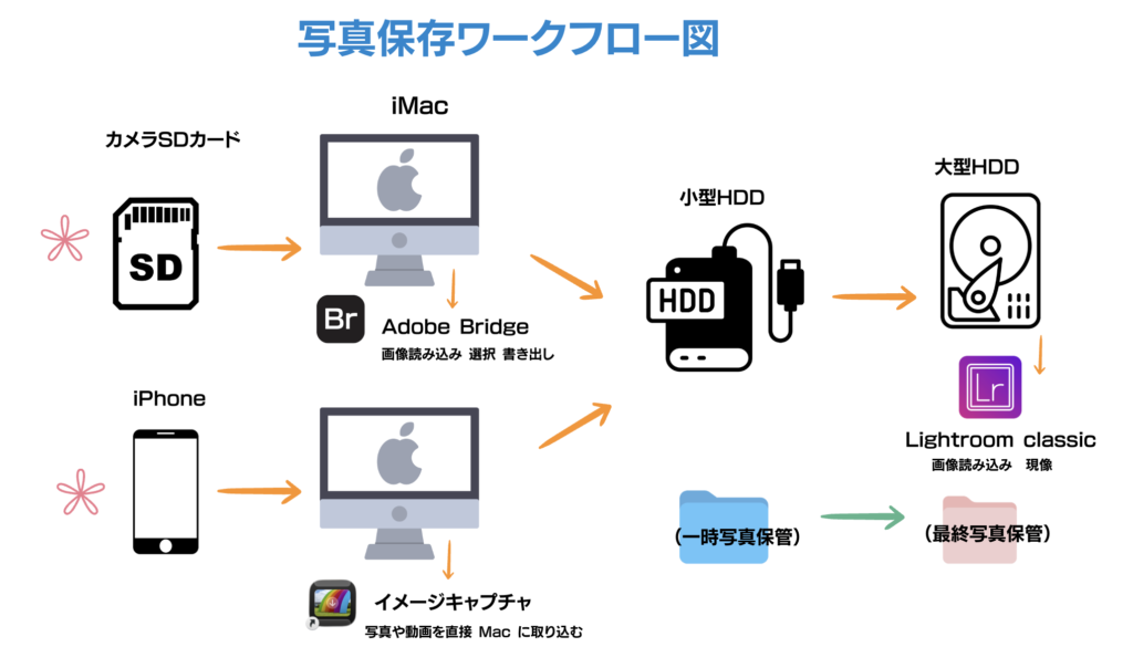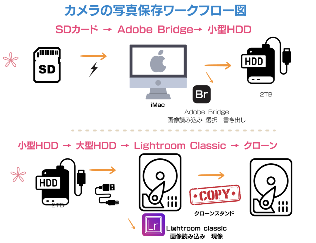 SDカード → Adobe Bridge → 小型HDD → 大型HDD → Lightroom Classic → クローン