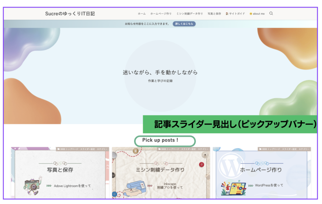 sucre「Pick up posts !」は、記事スライダーの上に表示される見出し(エリアタイトル)でした😊