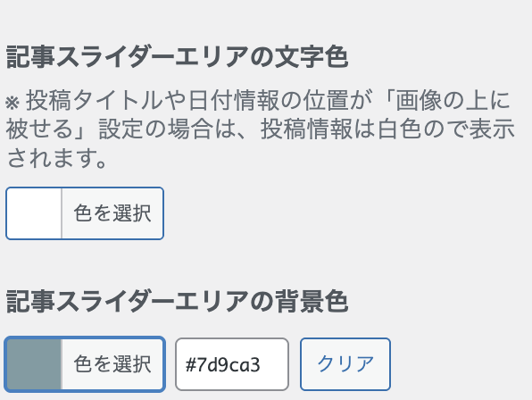 🛠️ WordPress管理画面<外観<カスタマイズ<トップページ<記事スライダー<記事スライダーエリアの文字色