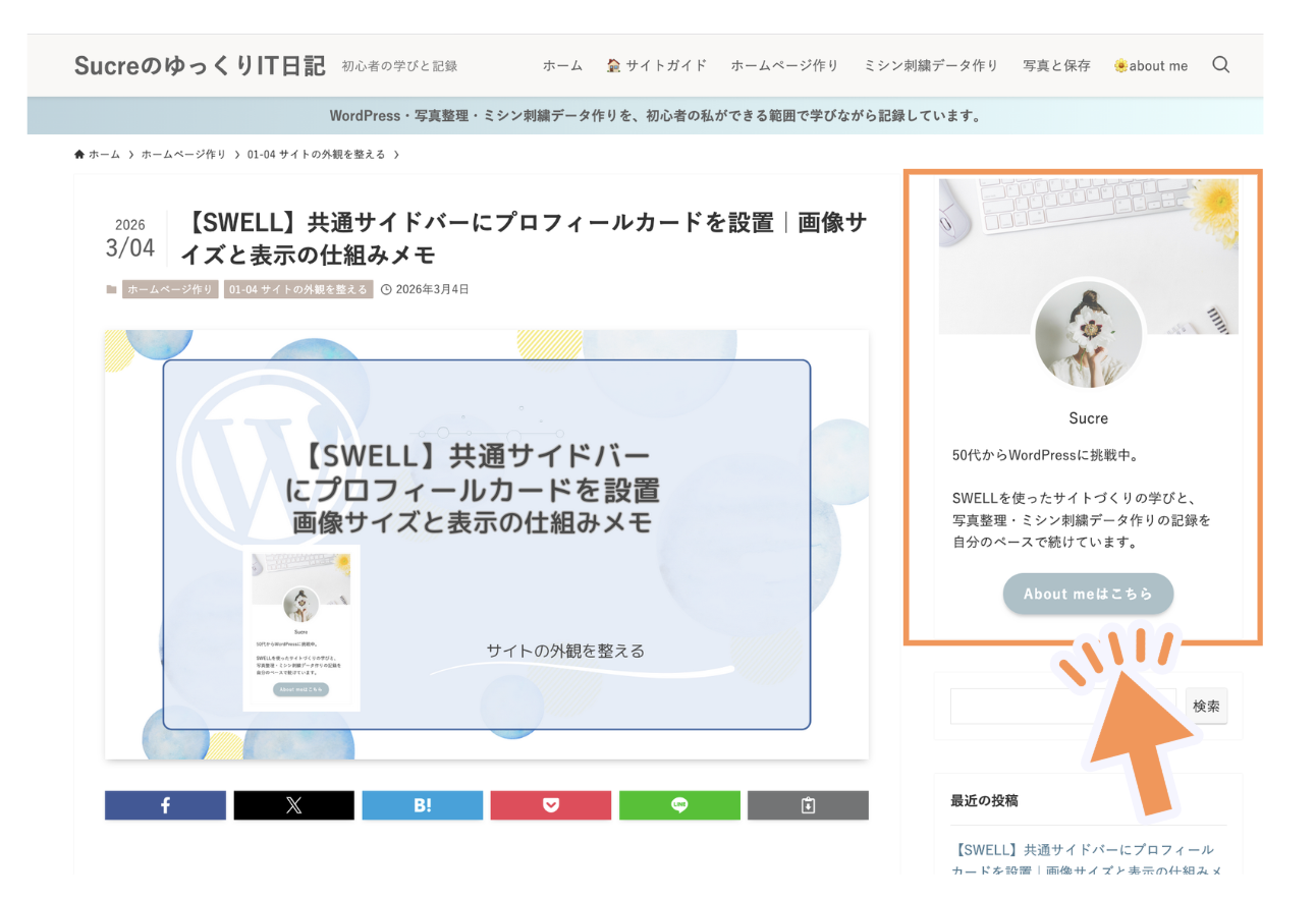 共通サイドバーに設定すると、すべてのページのサイドバーにプロフィールカードが表示されます。