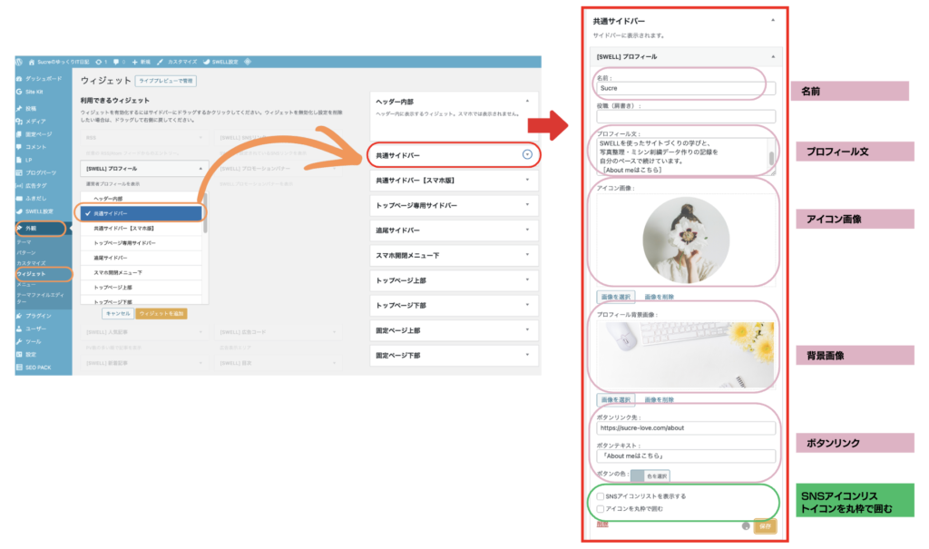 共通サイドバーのウィジェットで「SWELLプロフィール」を追加すると、次のような項目を設定できます。
