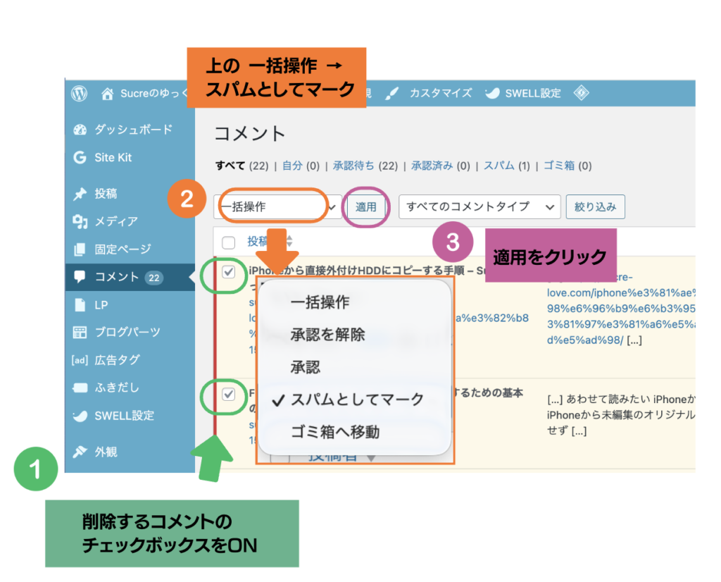 スパムコメント削除の手順
