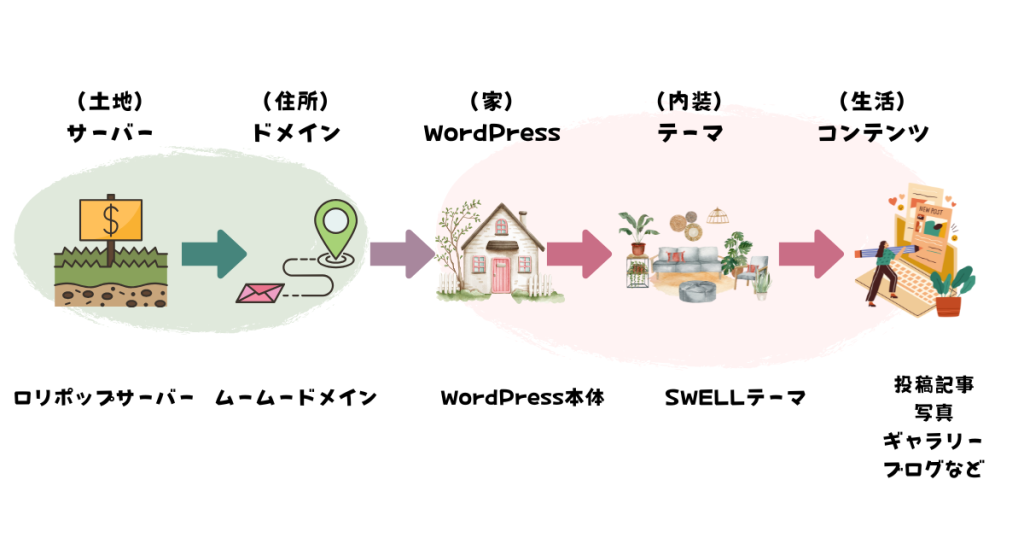 ホームページ作りを、土地・住所・家・内装・生活 にたとえると、とてもわかりやすくなります。